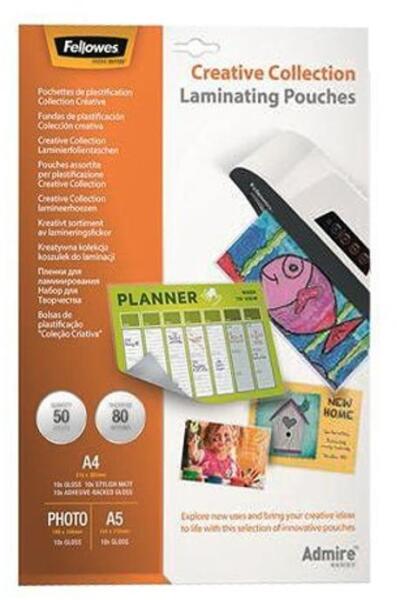 Fellowes Lamináló fólia, 80 mikron, 5 klf. méretben 5x10 db/doboz, Admire Creativ Fellowes® (5602301) - web24