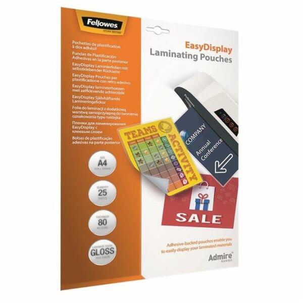 Fellowes Lamináló fólia, A4, 80 mikron, fényes, öntapadó hátlappal, 25 db/csomag, Fellowes® (5601703) - tintasziget