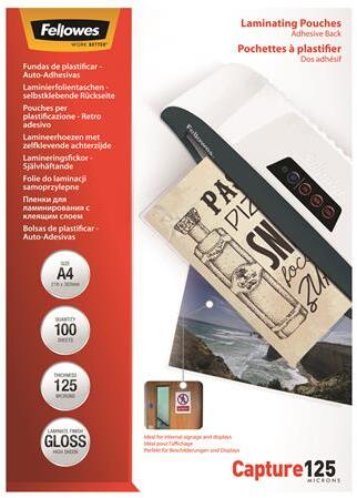 Meleglamináló fólia, 125 mikron, A4, fényes, öntapadó, 100 db, FELLOWES - IFW53289 - Meleglamináló fóliák - - Speciális meleglamináló fólia öntapadó hátlappal.