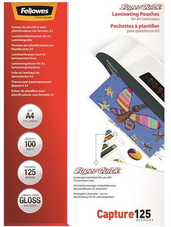 Meleglamináló fólia, 125 mikron, A4, SuperQuick, fényes, 100 db, FELLOWES - IFW54401 - Meleglamináló fóliák - - A laminálás 40%-al gyorsabb Fellowes SupreQuick lamináló fólia használatával