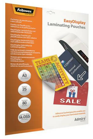 Fellowes Meleglamináló fólia, 80 mikron, A3, fényes, öntapadó, 25 db, FELLOWES "Admire Easy Display (5601803) - bestoffice