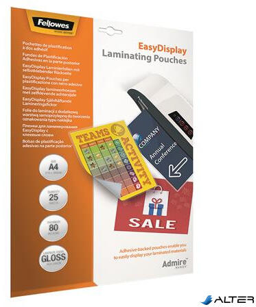 Fellowes Meleglamináló fólia, 80 mikron, A4, fényes, öntapadó, 25 db, FELLOWES "Admire Easy Display (5601703) - alter