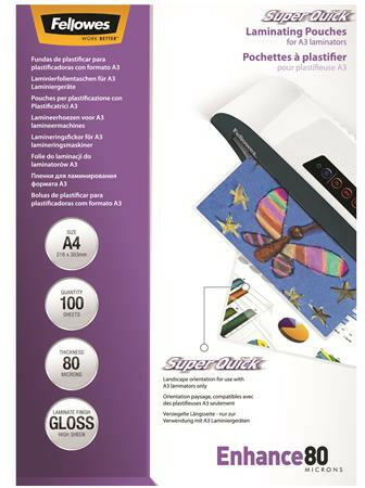 Meleglamináló fólia, 80 mikron, A4, SuperQuick, fényes, 100 db, FELLOWES