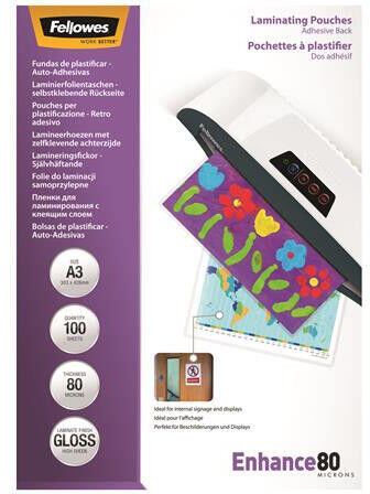 Meleglamináló fólia, 80 mikron, A3, fényes, öntapadó, 100 db, FELLOWES Pepita.hu